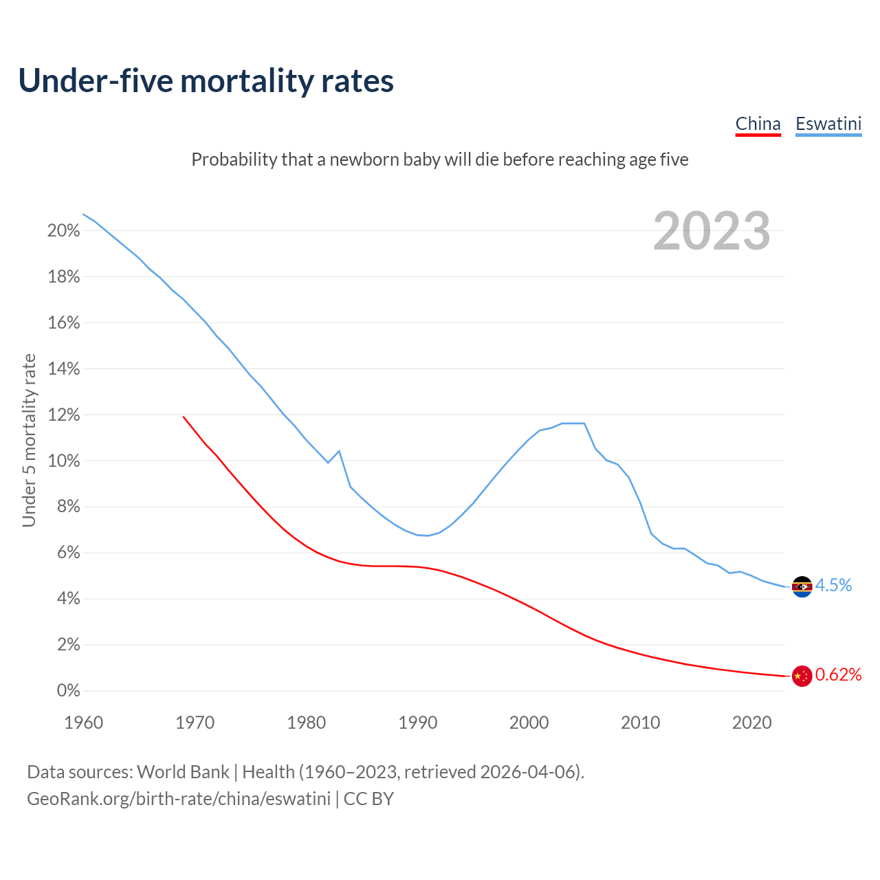 The chance that a newborn baby will die before reaching age five is 0.62% in China and 4.5% in Eswatini. Above is a chart with historical data on under-five mortality rates.