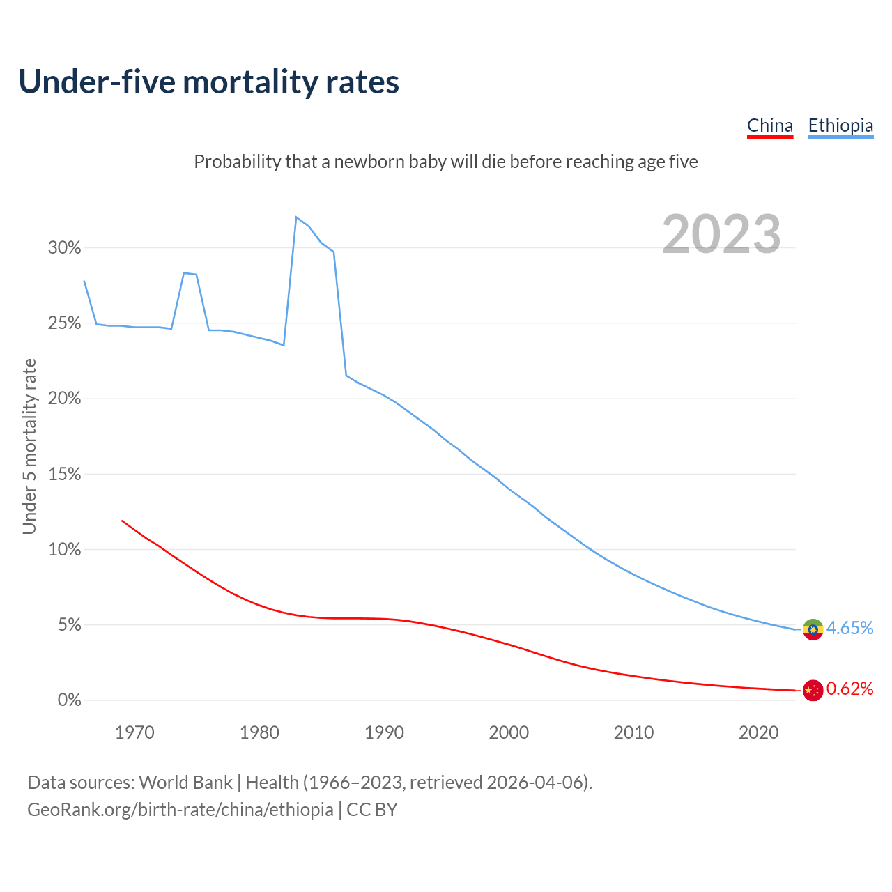 The chance that a newborn baby will die before reaching age five is 0.62% in China and 4.65% in Ethiopia. Above is a chart with historical data on under-five mortality rates.