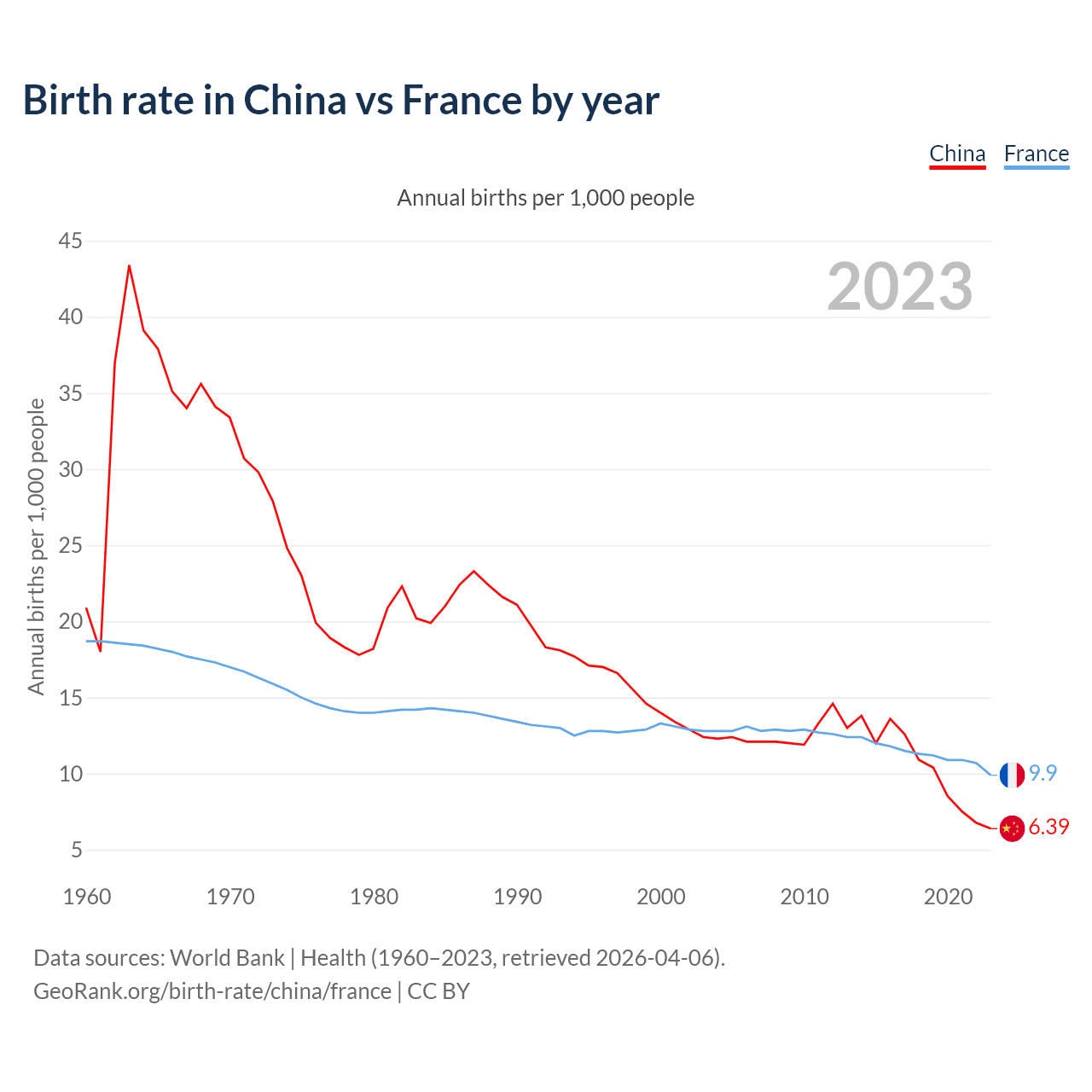 According to the latest available data on birth rates, the fertility rate in China was 1 children per woman in 2023, compared to 1.66 in France in 2023. The replacement level is considered to be 2.1 children per woman.