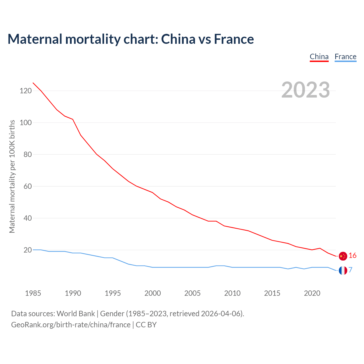 The maternal mortality rate, which is the probability of dying during childbirth or within 42 days of pregnancy termination, is 16 deaths per 100,000 live births in China, compared to 7 deaths in France.