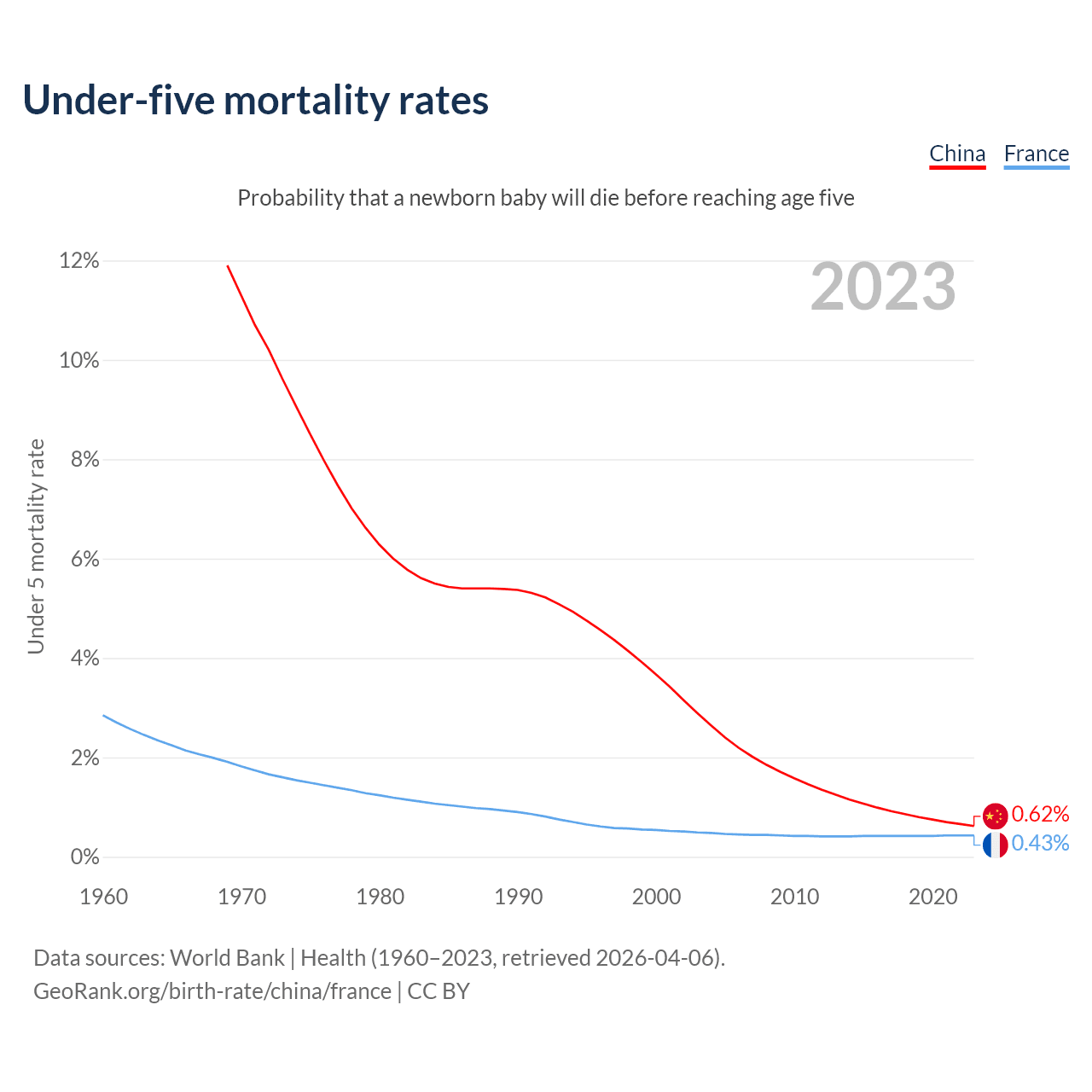 The chance that a newborn baby will die before reaching age five is 0.62% in China and 0.43% in France. Above is a chart with historical data on under-five mortality rates.