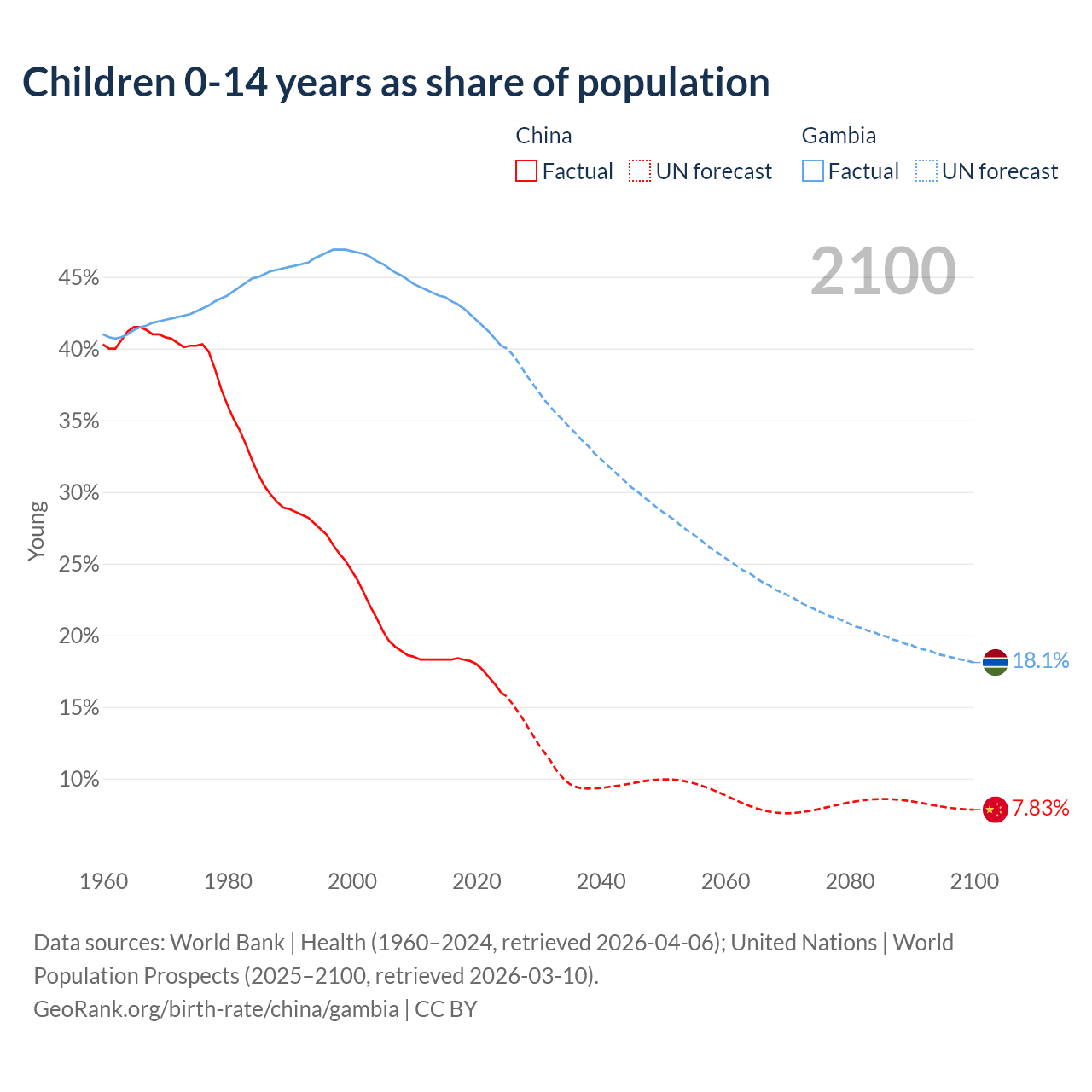 China has an annual birth rate of 6.39 births per 1,000 people, compared to 30.4 for the Gambia. The average number of children a woman is expected to have during her lifetime — the fertility rate, is 1 in China and 4.01 in the Gambia — 301% difference.