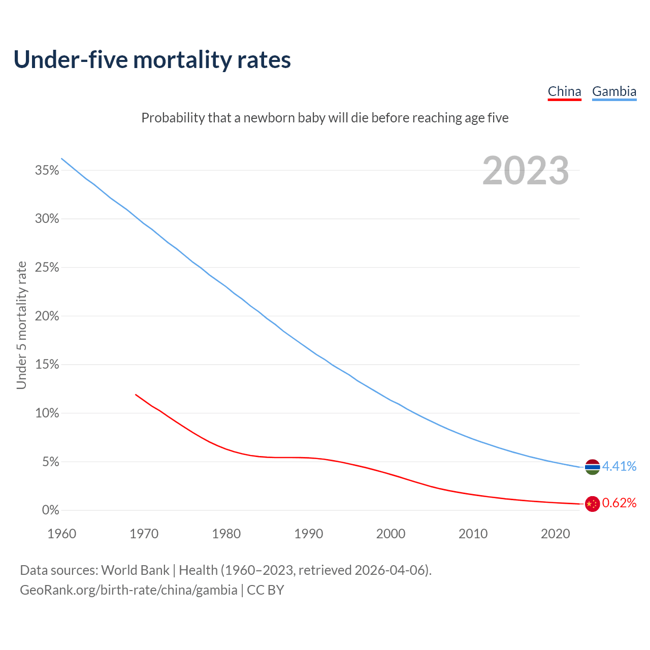 The chance that a newborn baby will die before reaching age five is 0.62% in China and 4.41% in the Gambia. Above is a chart with historical data on under-five mortality rates.