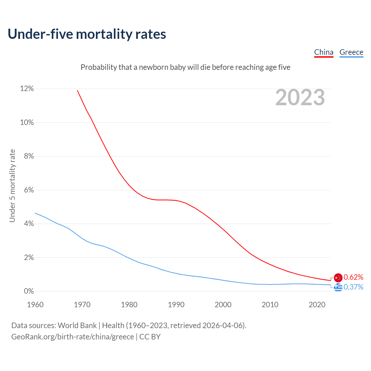 The chance that a newborn baby will die before reaching age five is 0.62% in China and 0.37% in Greece. Above is a chart with historical data on under-five mortality rates.