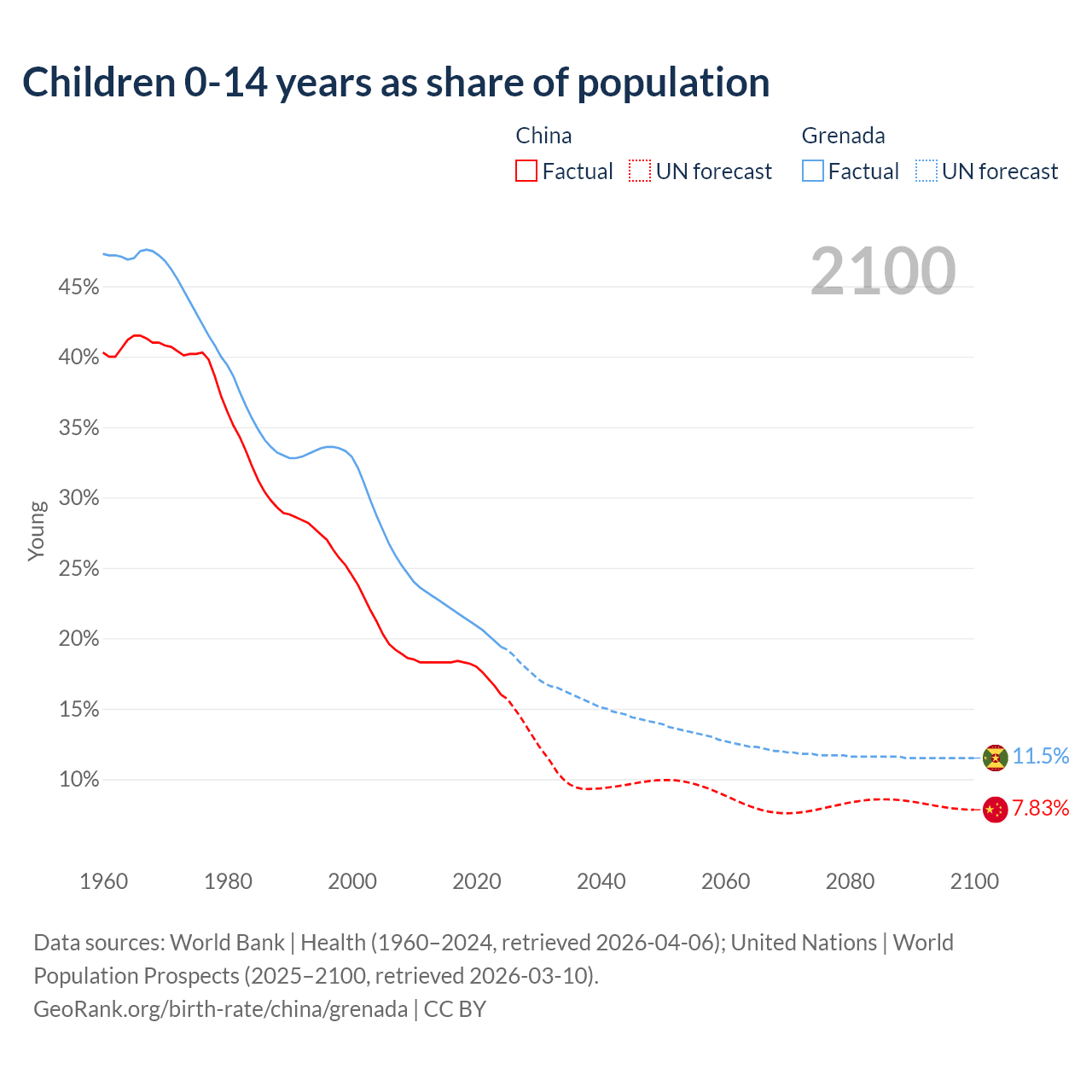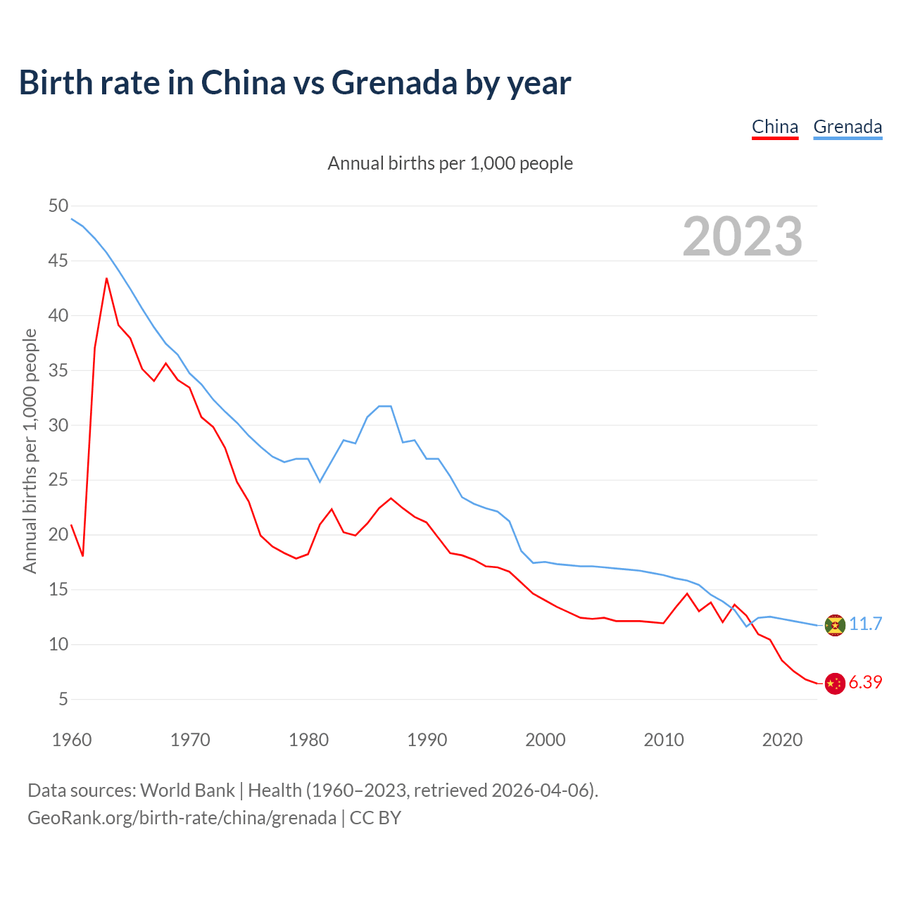 According to the latest available data on birth rates, the fertility rate in China was 1 children per woman in 2023, compared to 1.49 in Grenada in 2023. The replacement level is considered to be 2.1 children per woman.