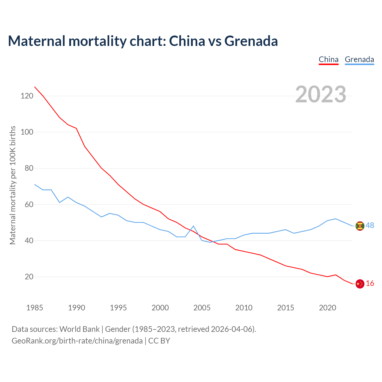 The maternal mortality rate, which is the probability of dying during childbirth or within 42 days of pregnancy termination, is 16 deaths per 100,000 live births in China, compared to 48 deaths in Grenada.