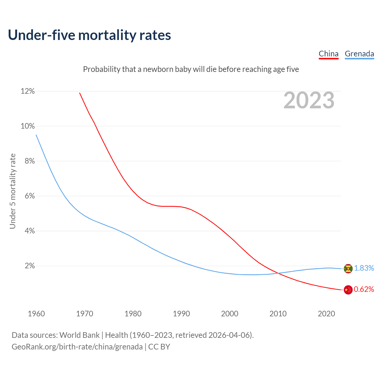 The chance that a newborn baby will die before reaching age five is 0.62% in China and 1.83% in Grenada. Above is a chart with historical data on under-five mortality rates.