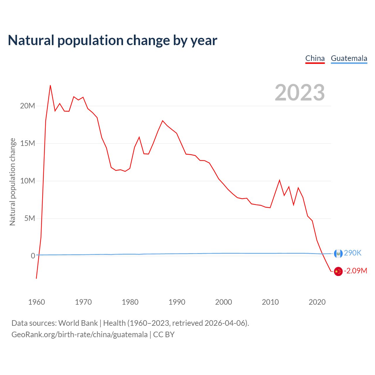 According to the latest available data on birth rates, the fertility rate in China was 1 children per woman in 2023, compared to 2.31 in Guatemala in 2023. The replacement level is considered to be 2.1 children per woman.