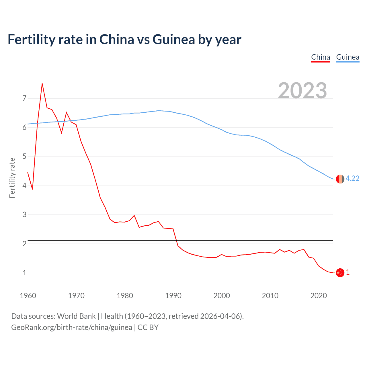 According to the latest available data on birth rates, the fertility rate in China was 1 children per woman in 2023, compared to 4.22 in Guinea in 2023. The replacement level is considered to be 2.1 children per woman.