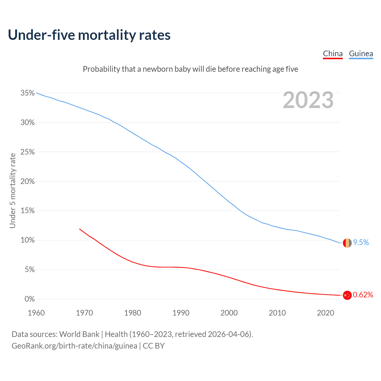 The chance that a newborn baby will die before reaching age five is 0.62% in China and 9.5% in Guinea. Above is a chart with historical data on under-five mortality rates.