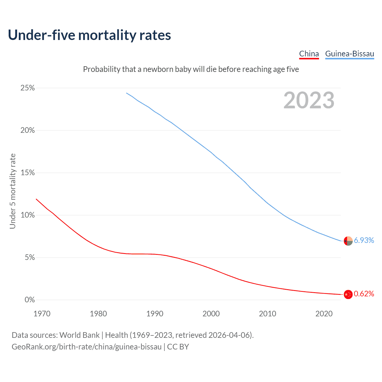 The chance that a newborn baby will die before reaching age five is 0.62% in China and 6.93% in Guinea-Bissau. Above is a chart with historical data on under-five mortality rates.