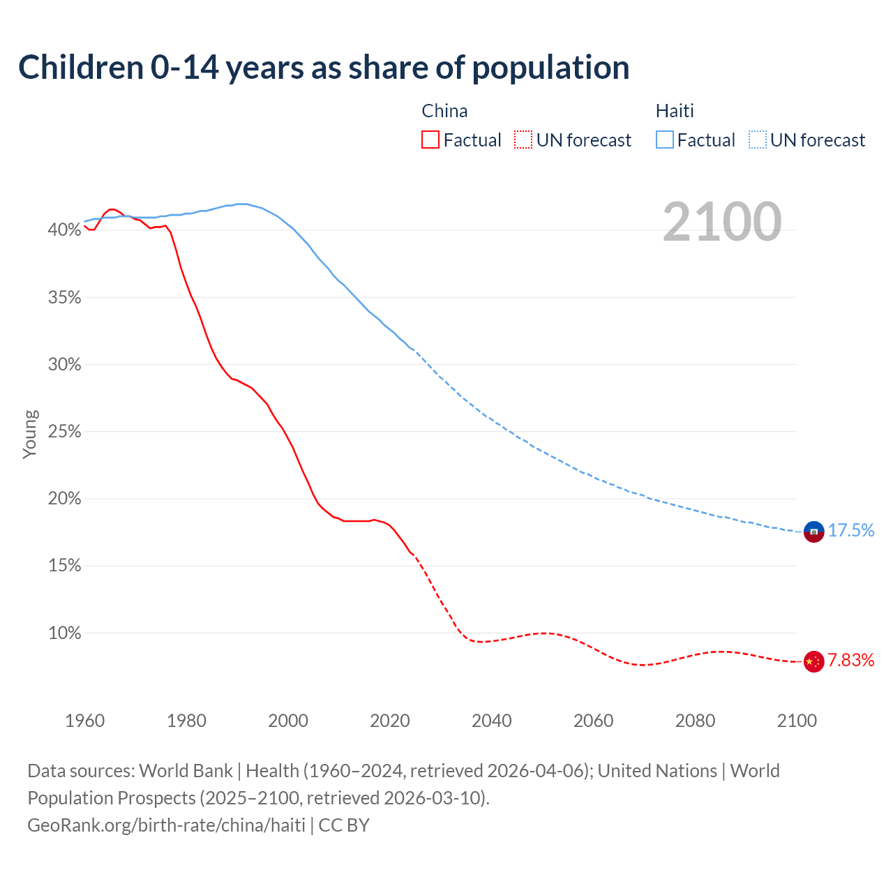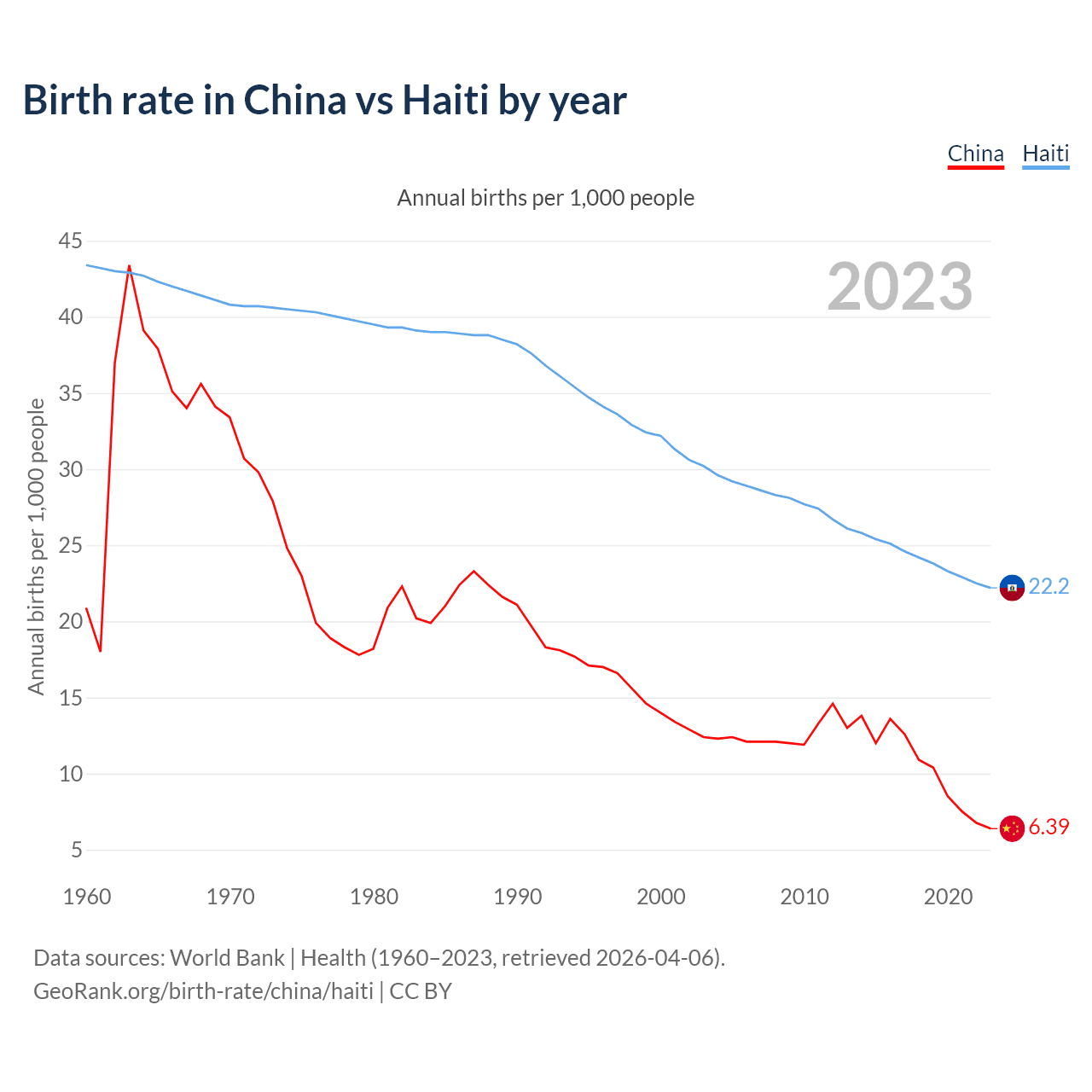 According to the latest available data on birth rates, the fertility rate in China was 1 children per woman in 2023, compared to 2.66 in Haiti in 2023. The replacement level is considered to be 2.1 children per woman.