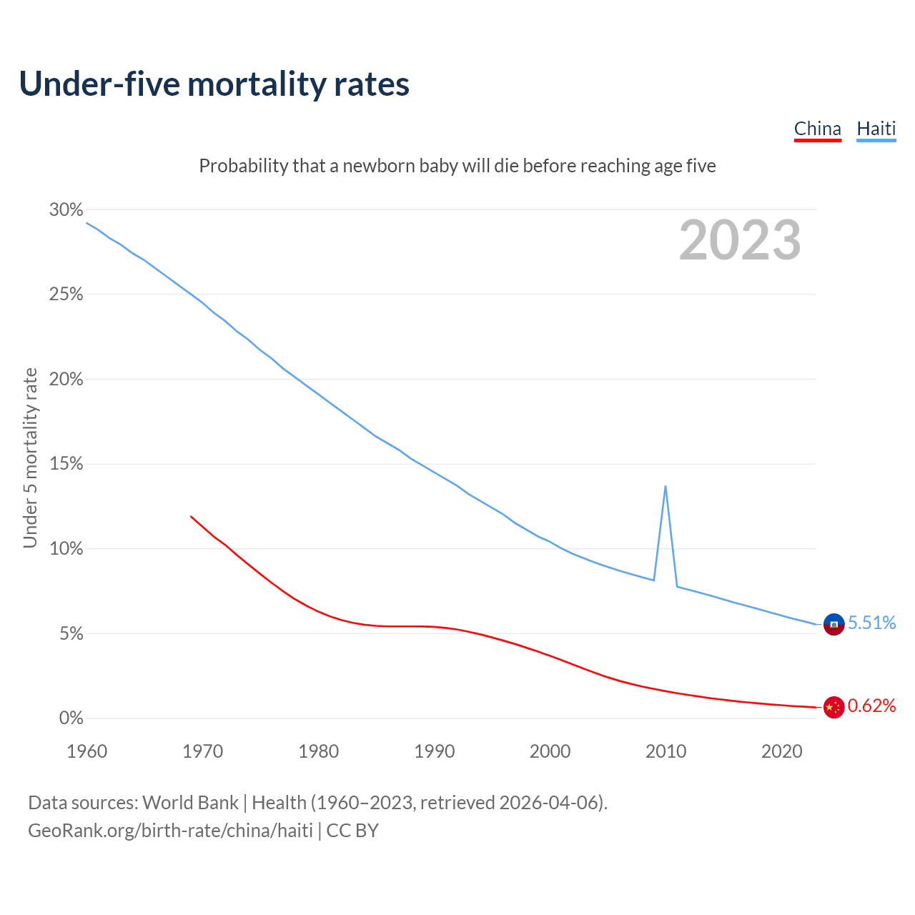 The chance that a newborn baby will die before reaching age five is 0.62% in China and 5.51% in Haiti. Above is a chart with historical data on under-five mortality rates.