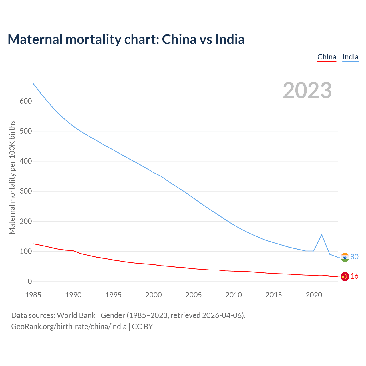 The maternal mortality rate, which is the probability of dying during childbirth or within 42 days of pregnancy termination, is 16 deaths per 100,000 live births in China, compared to 80 deaths in India.