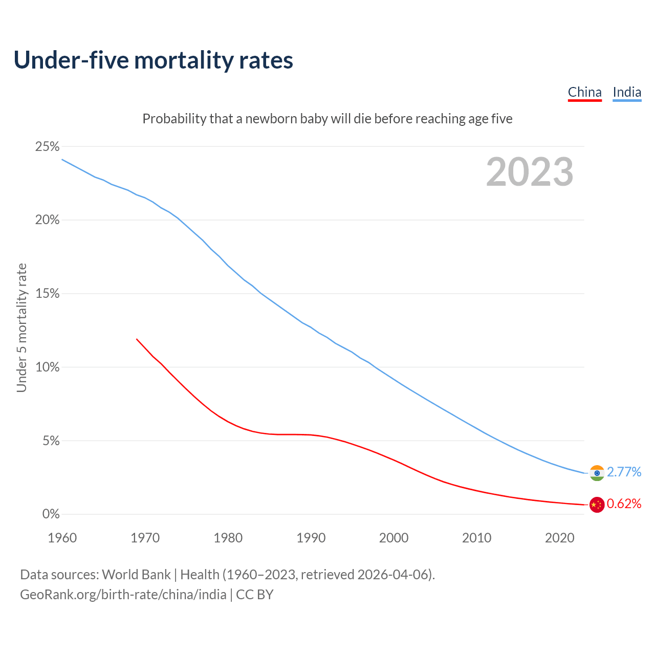 The chance that a newborn baby will die before reaching age five is 0.62% in China and 2.77% in India. Above is a chart with historical data on under-five mortality rates.