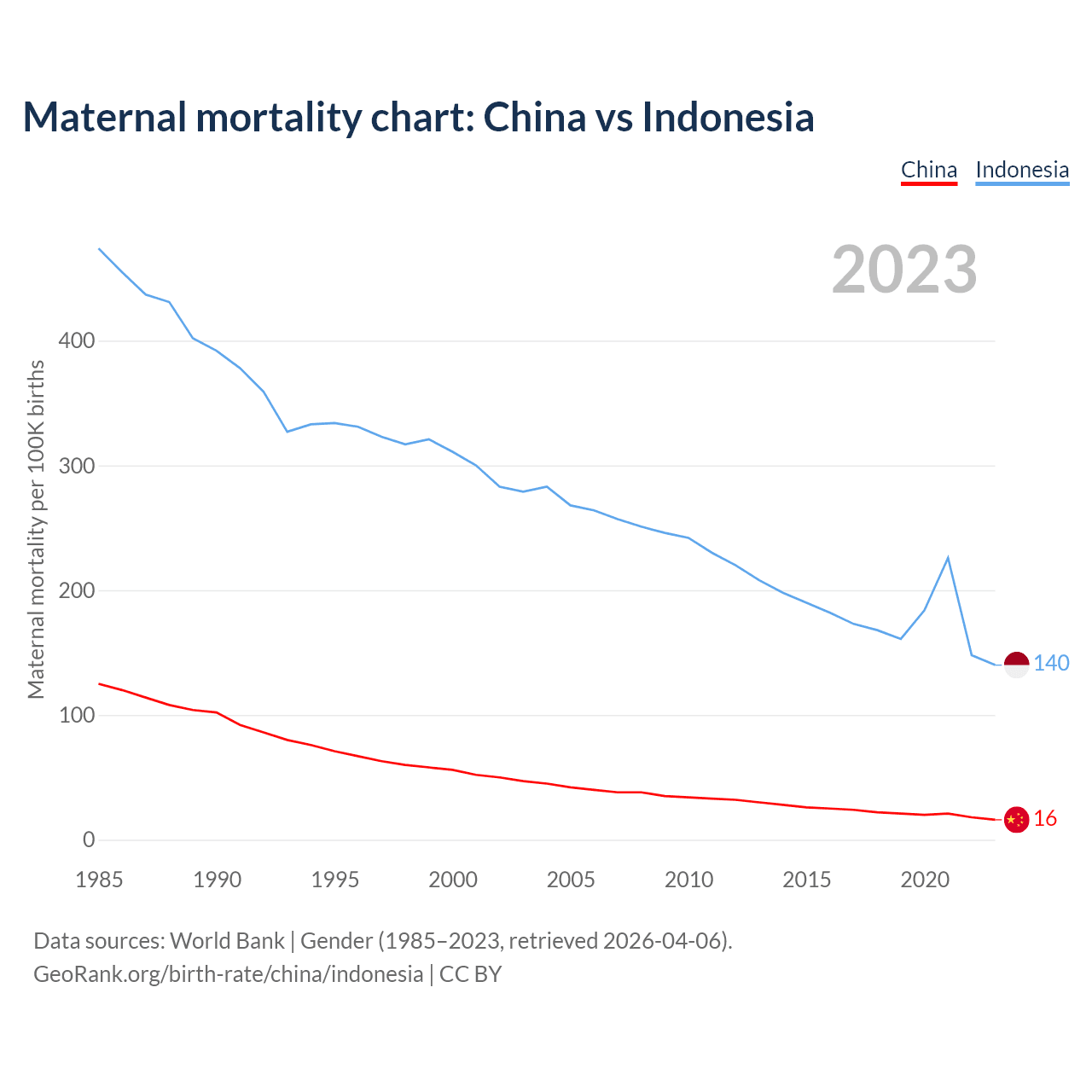 The maternal mortality rate, which is the probability of dying during childbirth or within 42 days of pregnancy termination, is 16 deaths per 100,000 live births in China, compared to 140 deaths in Indonesia.