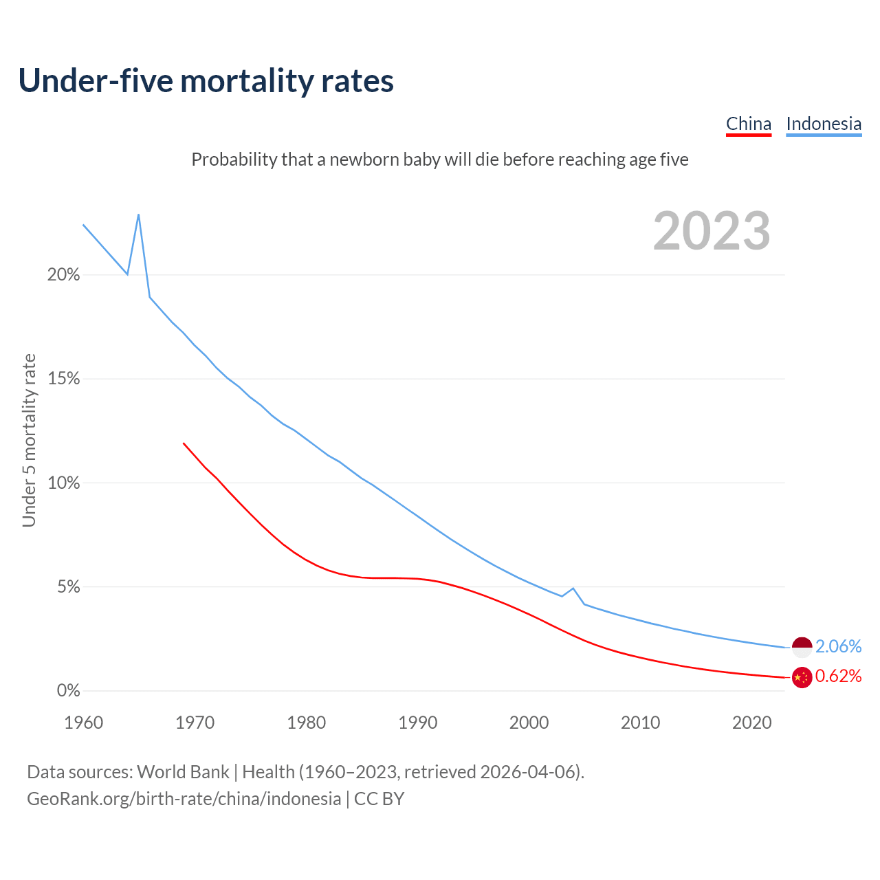 The chance that a newborn baby will die before reaching age five is 0.62% in China and 2.06% in Indonesia. Above is a chart with historical data on under-five mortality rates.