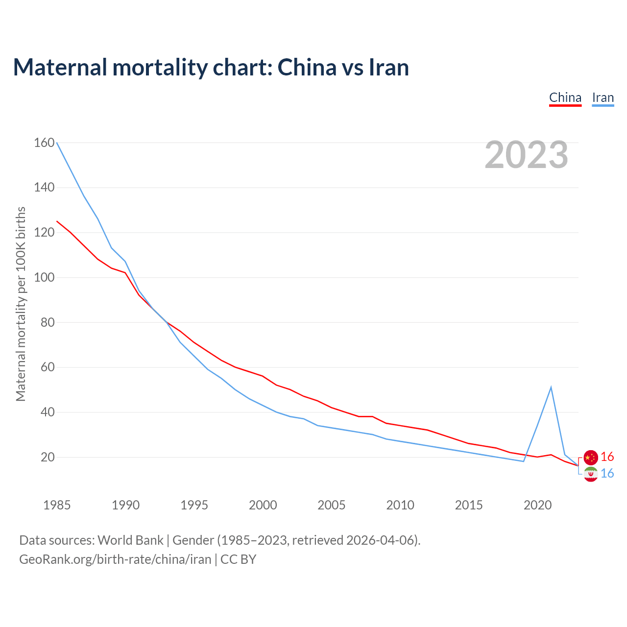 The maternal mortality rate, which is the probability of dying during childbirth or within 42 days of pregnancy termination, is 16 deaths per 100,000 live births in China, compared to 16 deaths in Iran.
