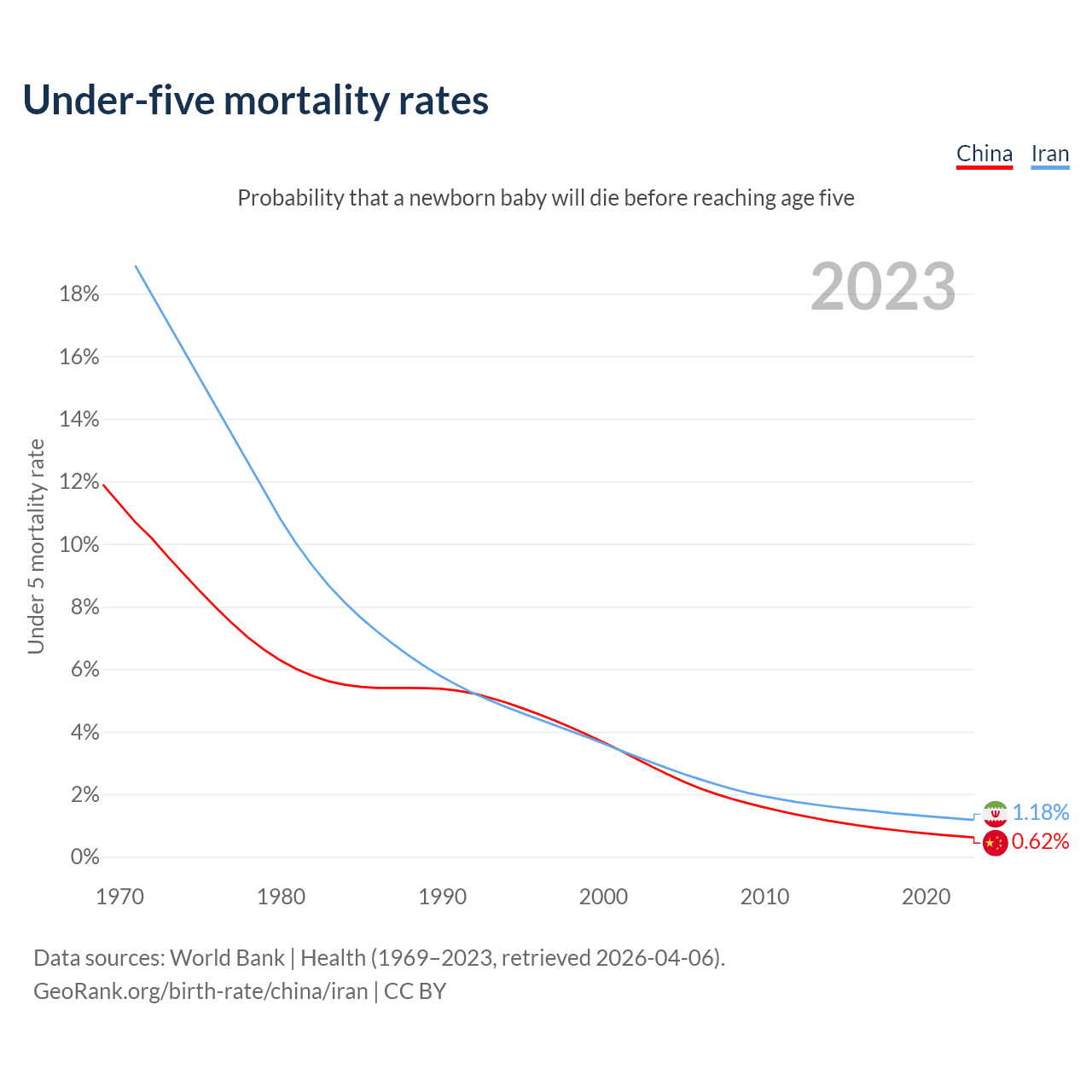 The chance that a newborn baby will die before reaching age five is 0.62% in China and 1.18% in Iran. Above is a chart with historical data on under-five mortality rates.