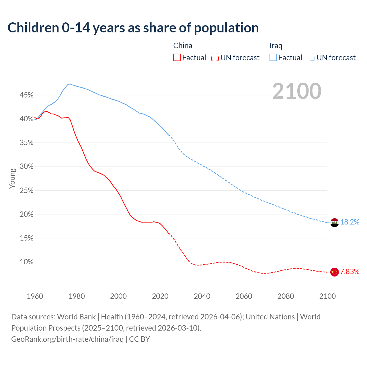 According to the latest available data on birth rates, the fertility rate in China was 1 children per woman in 2023, compared to 3.25 in Iraq in 2023. The replacement level is considered to be 2.1 children per woman.