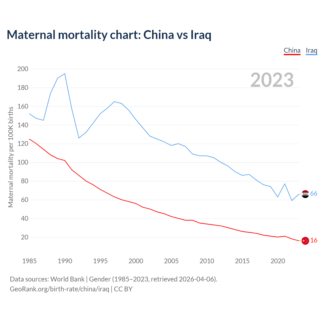 The maternal mortality rate, which is the probability of dying during childbirth or within 42 days of pregnancy termination, is 16 deaths per 100,000 live births in China, compared to 66 deaths in Iraq.