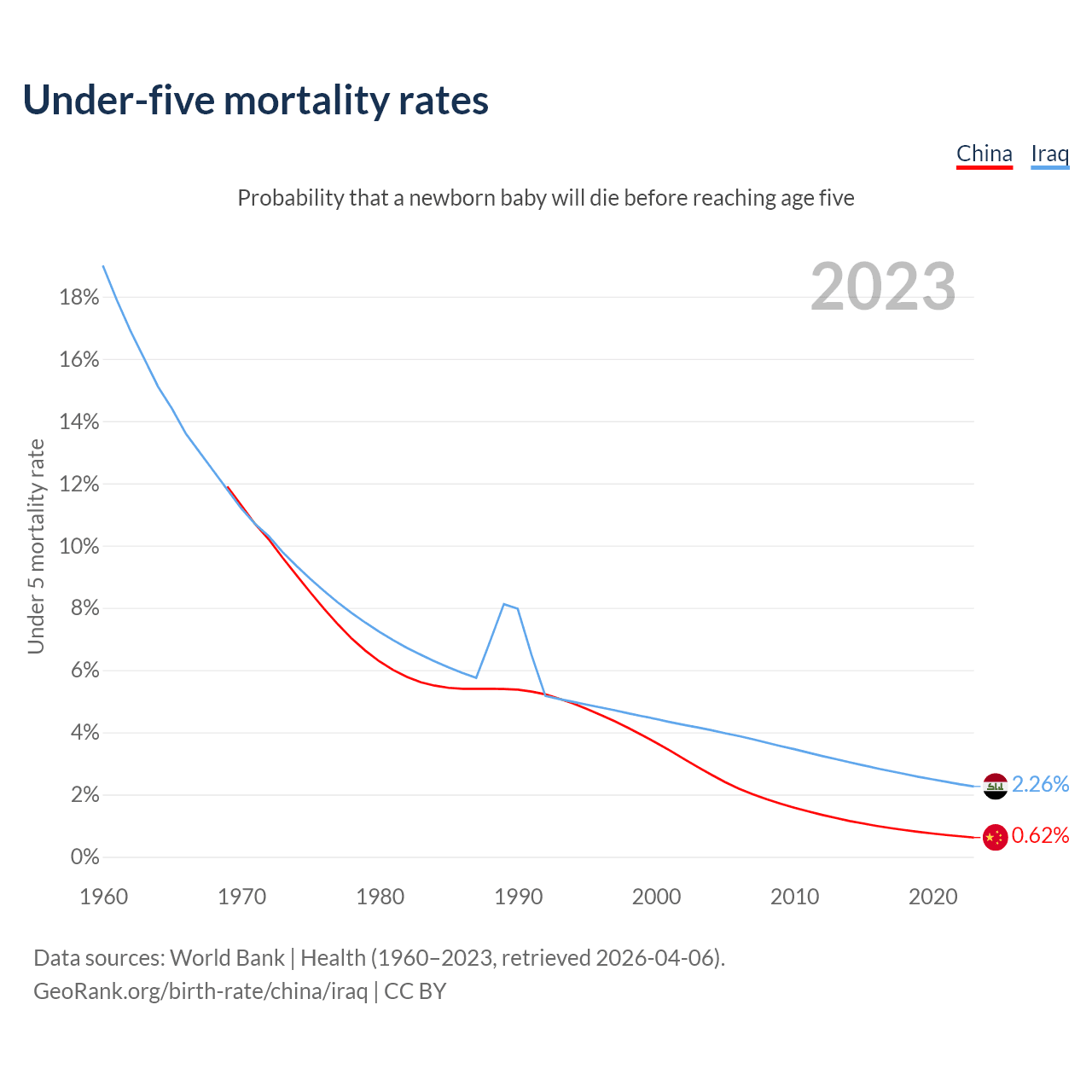 The chance that a newborn baby will die before reaching age five is 0.62% in China and 2.26% in Iraq. Above is a chart with historical data on under-five mortality rates.
