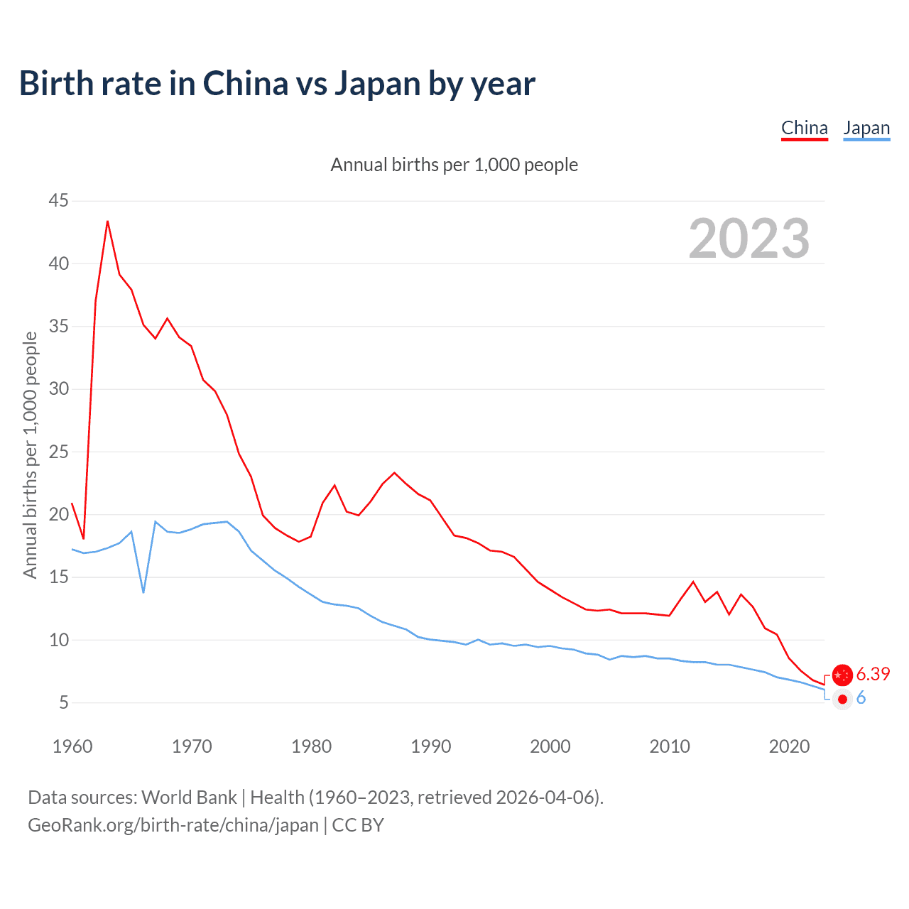 1960 vs 2023, the fertility rate has decreased by 77.6% in China and by 40% in Japan — in 1960, it was 4.45 and 2, respectively.
