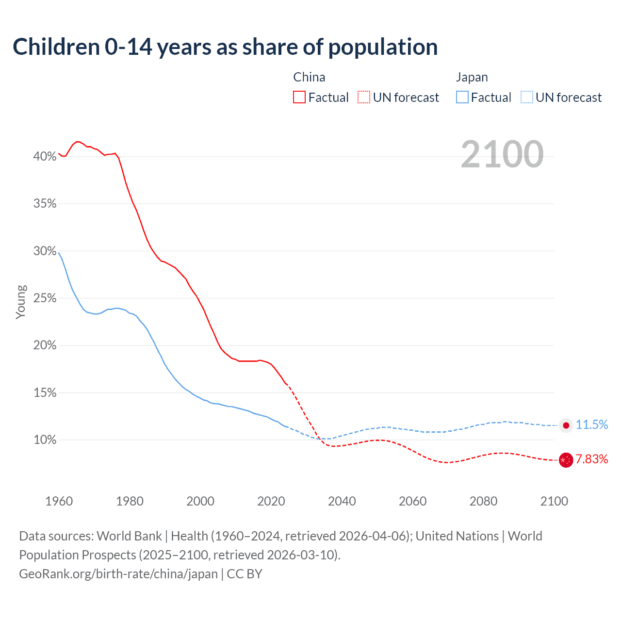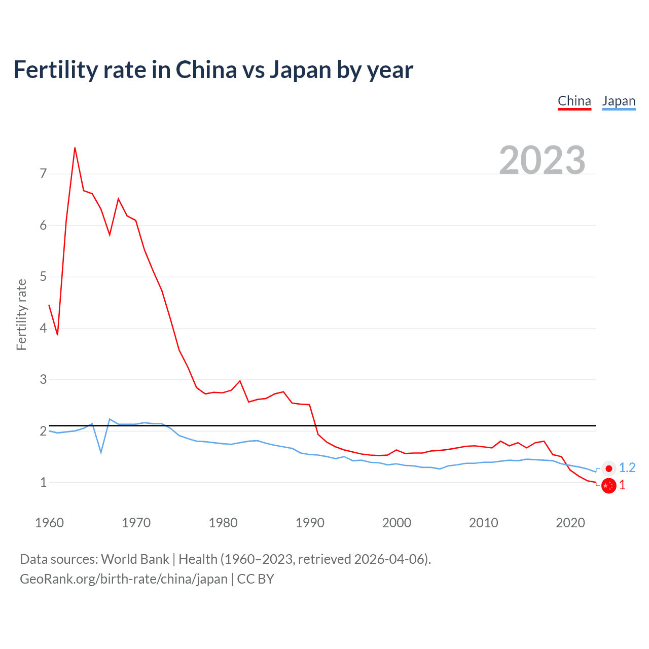 According to the latest available data on birth rates, the fertility rate in China was 1 children per woman in 2023, compared to 1.2 in Japan in 2023. The replacement level is considered to be 2.1 children per woman.