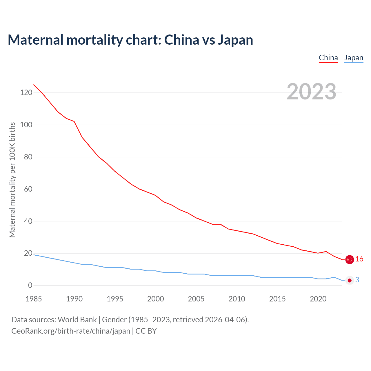 The maternal mortality rate, which is the probability of dying during childbirth or within 42 days of pregnancy termination, is 16 deaths per 100,000 live births in China, compared to 3 deaths in Japan.