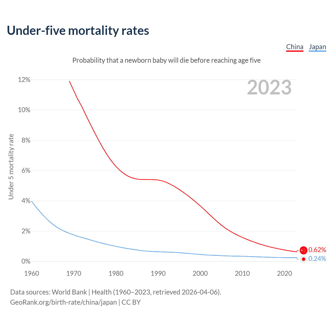 The chance that a newborn baby will die before reaching age five is 0.62% in China and 0.24% in Japan. Above is a chart with historical data on under-five mortality rates.