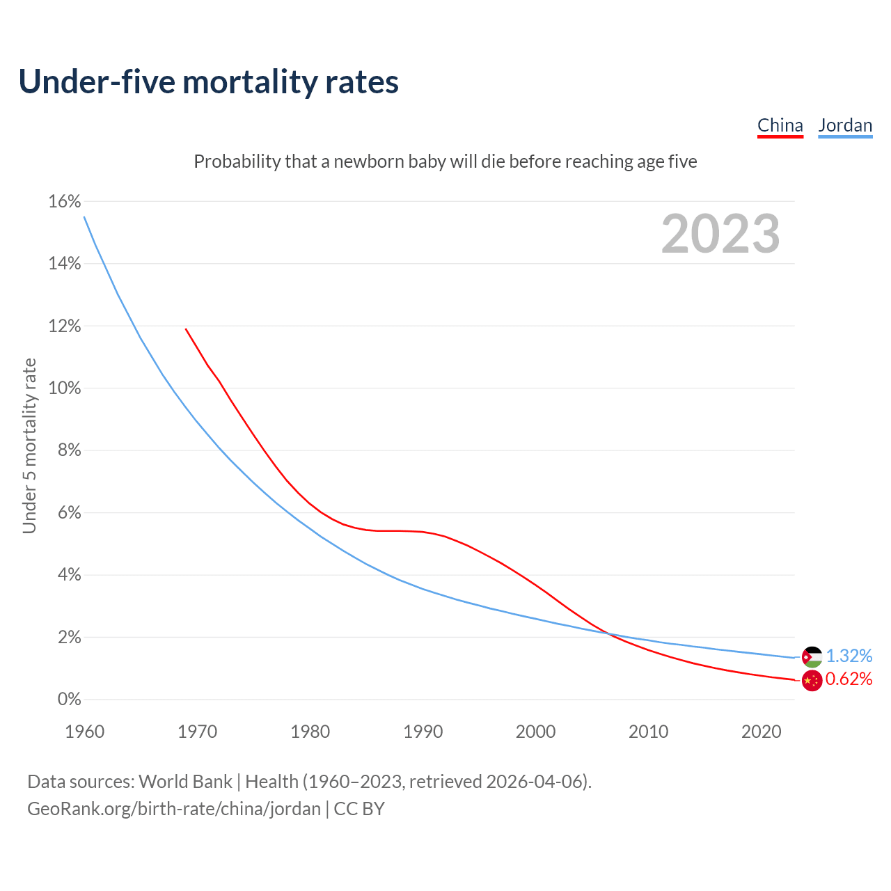The chance that a newborn baby will die before reaching age five is 0.62% in China and 1.32% in Jordan. Above is a chart with historical data on under-five mortality rates.