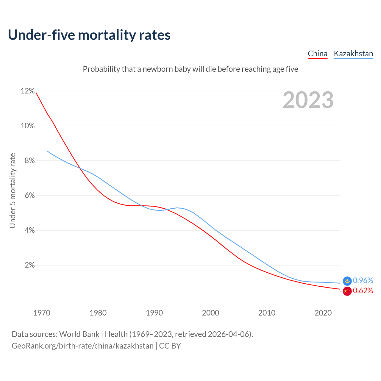 The chance that a newborn baby will die before reaching age five is 0.62% in China and 0.96% in Kazakhstan. Above is a chart with historical data on under-five mortality rates.