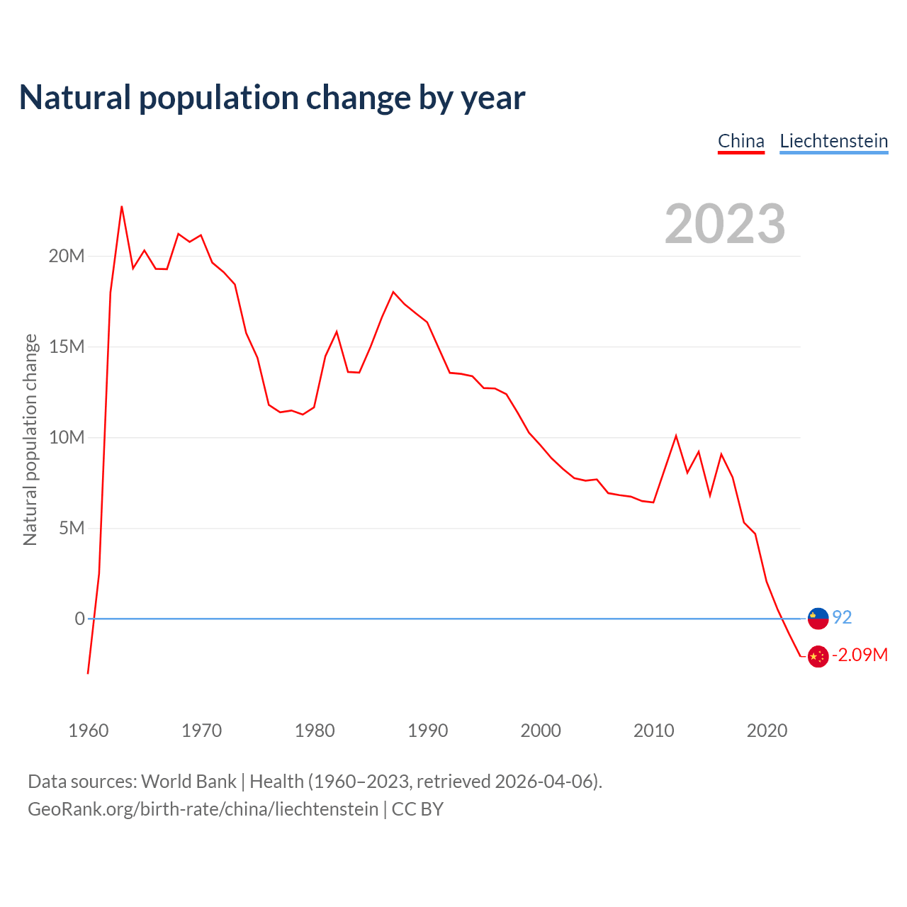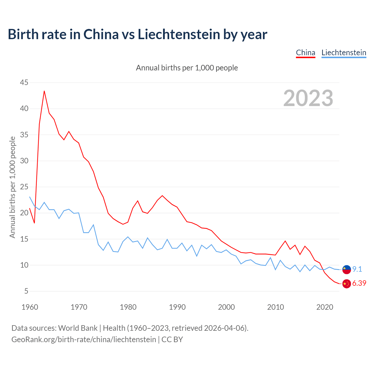 According to the latest available data on birth rates, the fertility rate in China was 1 children per woman in 2023, compared to 1.45 in Liechtenstein in 2023. The replacement level is considered to be 2.1 children per woman.
