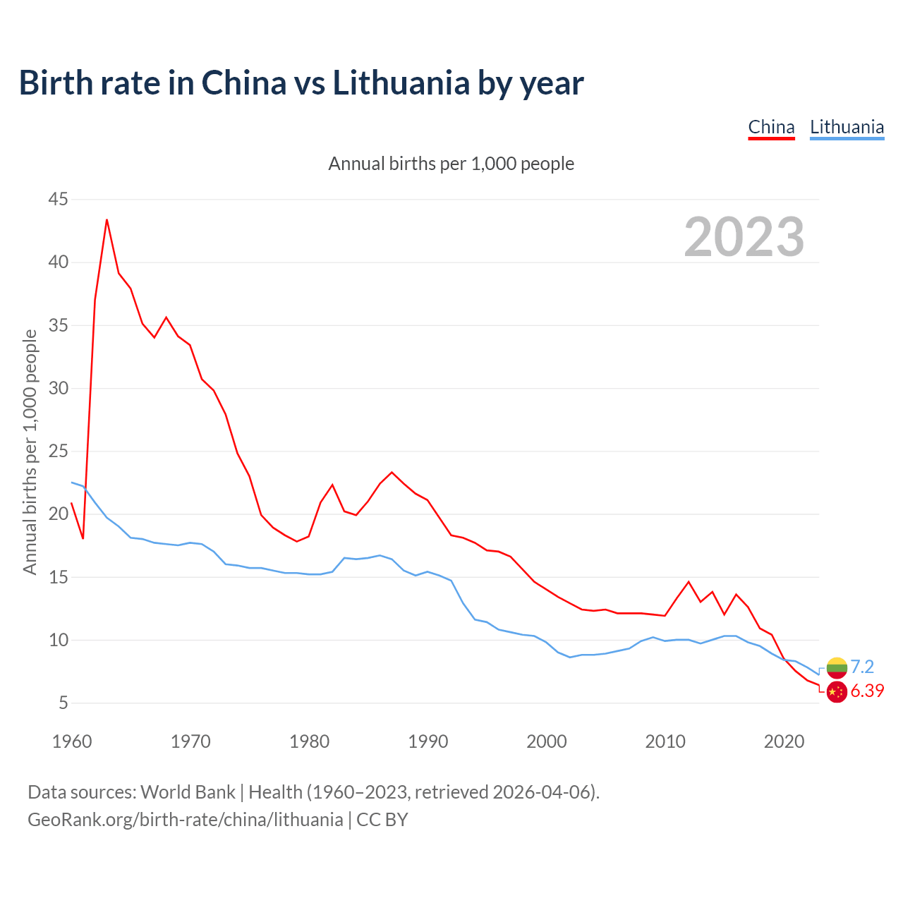According to the latest available data on birth rates, the fertility rate in China was 1 children per woman in 2023, compared to 1.18 in Lithuania in 2023. The replacement level is considered to be 2.1 children per woman.