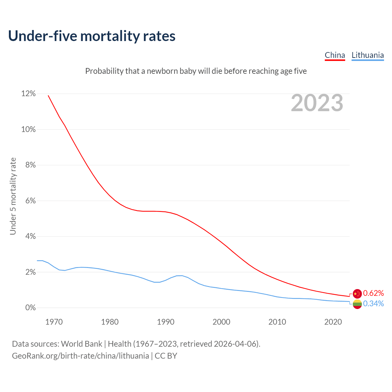 The chance that a newborn baby will die before reaching age five is 0.62% in China and 0.34% in Lithuania. Above is a chart with historical data on under-five mortality rates.