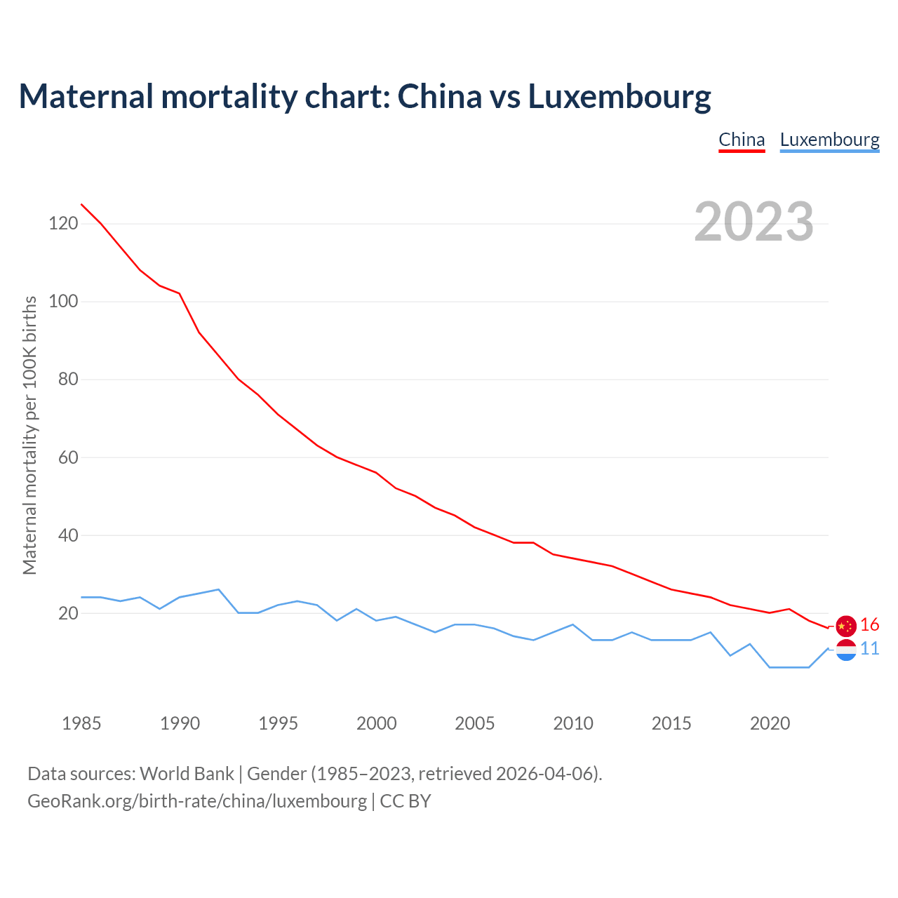 The maternal mortality rate, which is the probability of dying during childbirth or within 42 days of pregnancy termination, is 16 deaths per 100,000 live births in China, compared to 11 deaths in Luxembourg.