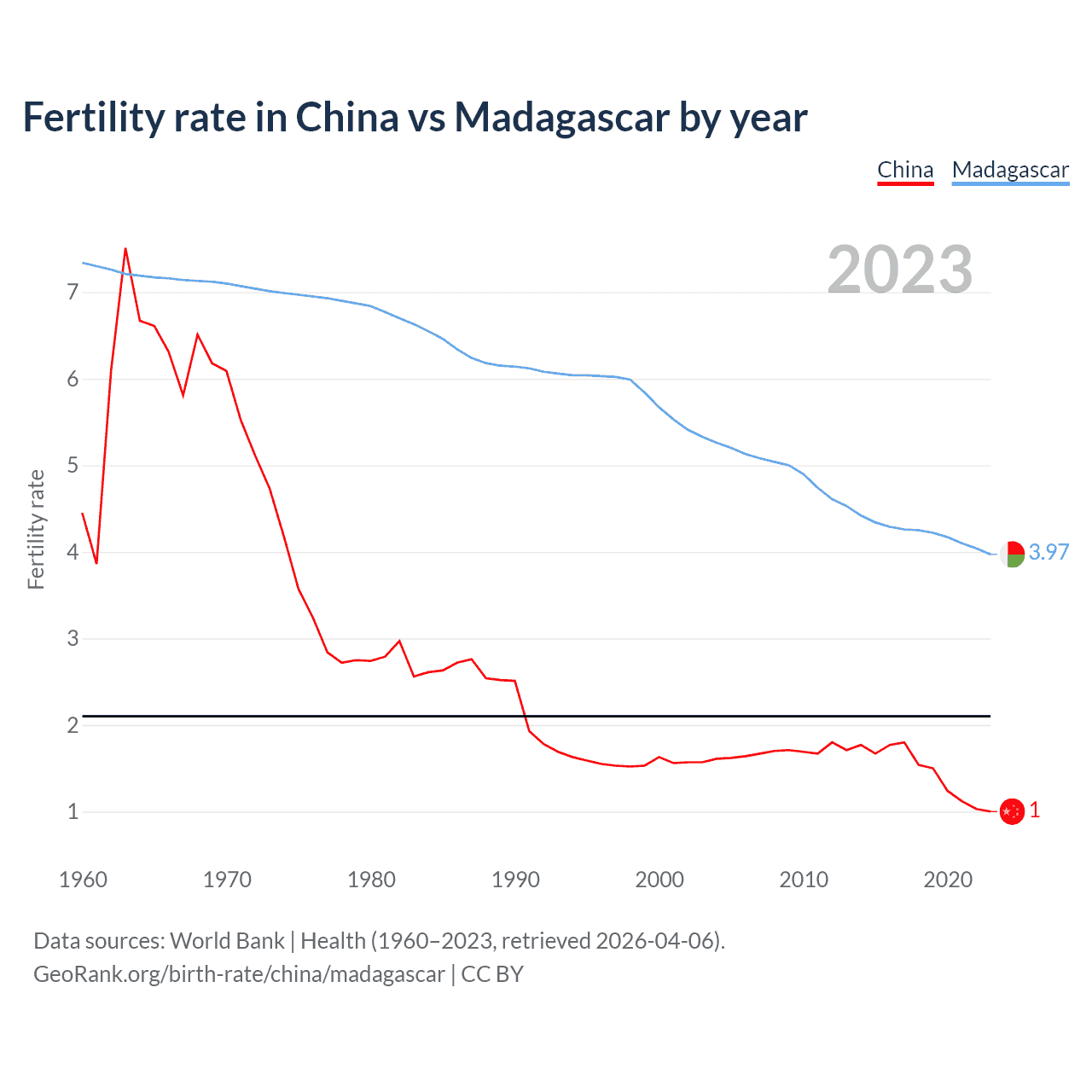 According to the latest available data on birth rates, the fertility rate in China was 1 children per woman in 2023, compared to 3.97 in Madagascar in 2023. The replacement level is considered to be 2.1 children per woman.