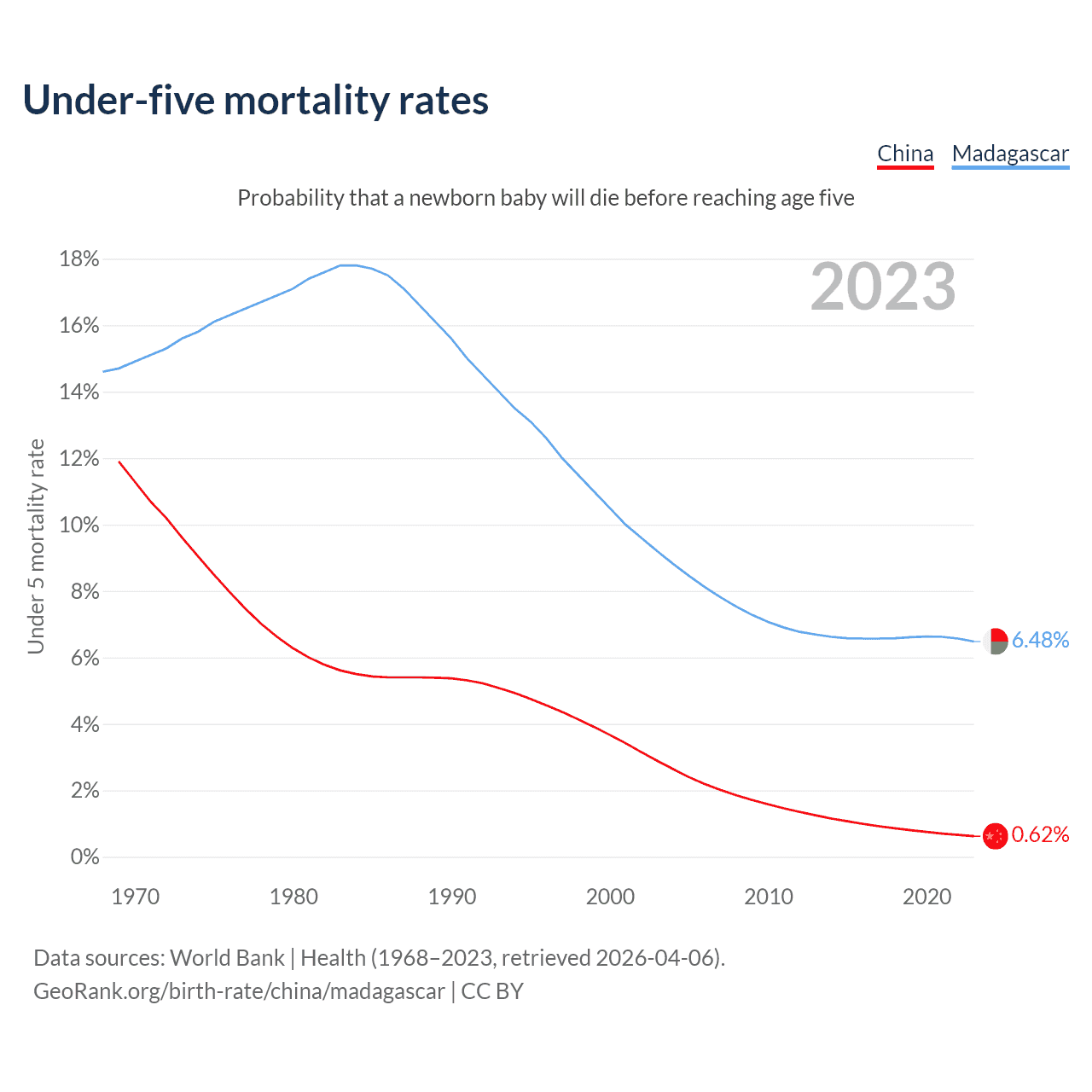 The chance that a newborn baby will die before reaching age five is 0.62% in China and 6.48% in Madagascar. Above is a chart with historical data on under-five mortality rates.