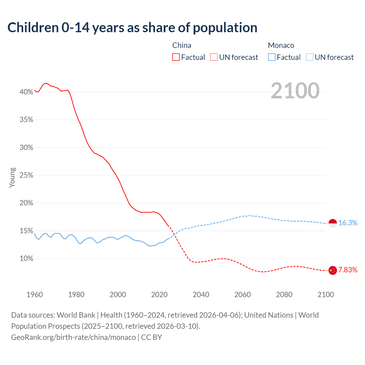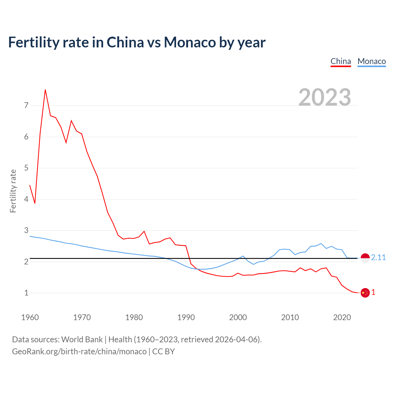 According to the latest available data on birth rates, the fertility rate in China was 1 children per woman in 2023, compared to 2.11 in Monaco in 2023. The replacement level is considered to be 2.1 children per woman.