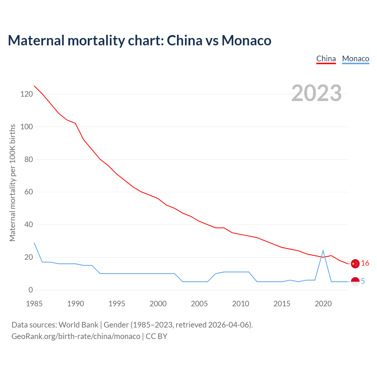 The maternal mortality rate, which is the probability of dying during childbirth or within 42 days of pregnancy termination, is 16 deaths per 100,000 live births in China, compared to 5 deaths in Monaco.