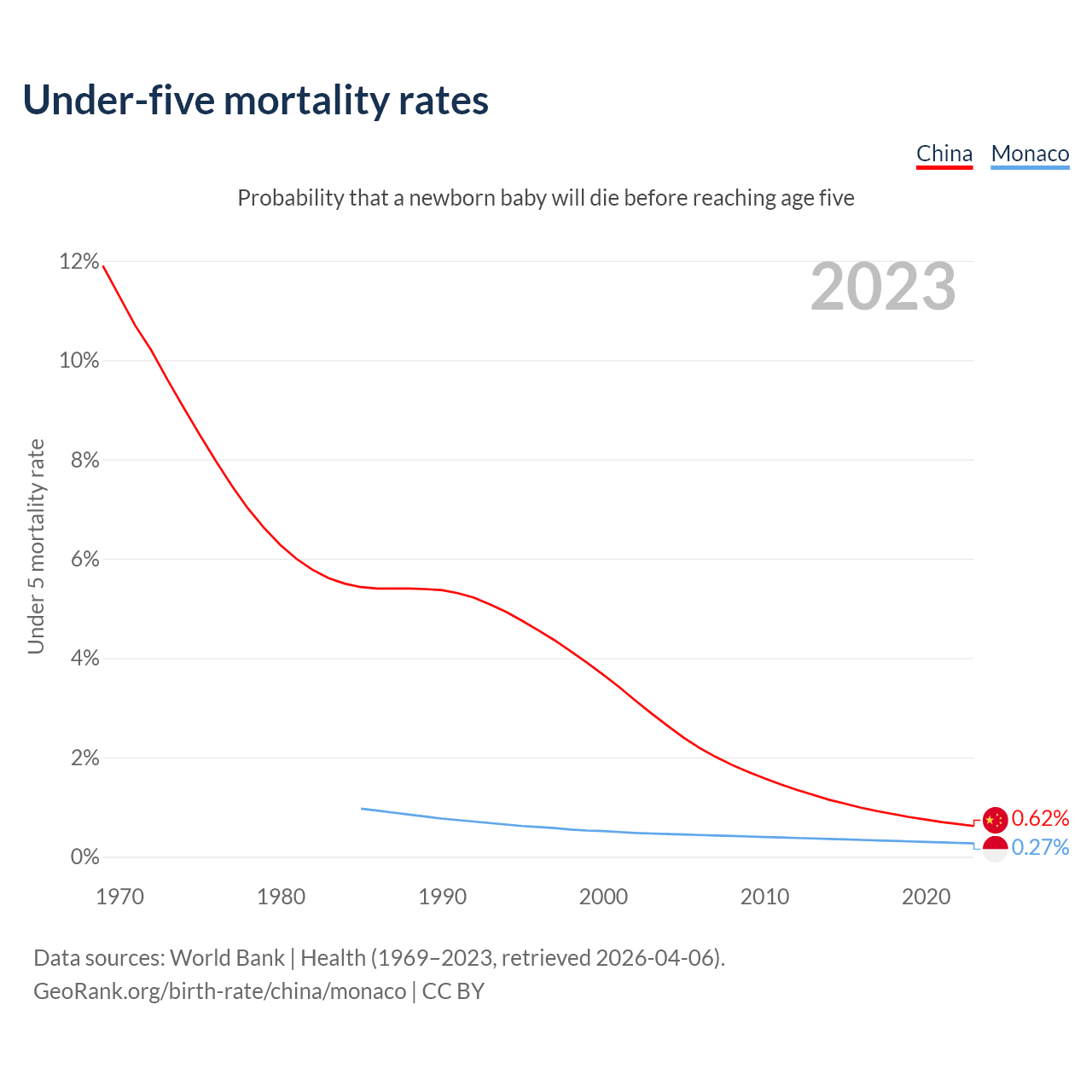 The chance that a newborn baby will die before reaching age five is 0.62% in China and 0.27% in Monaco. Above is a chart with historical data on under-five mortality rates.