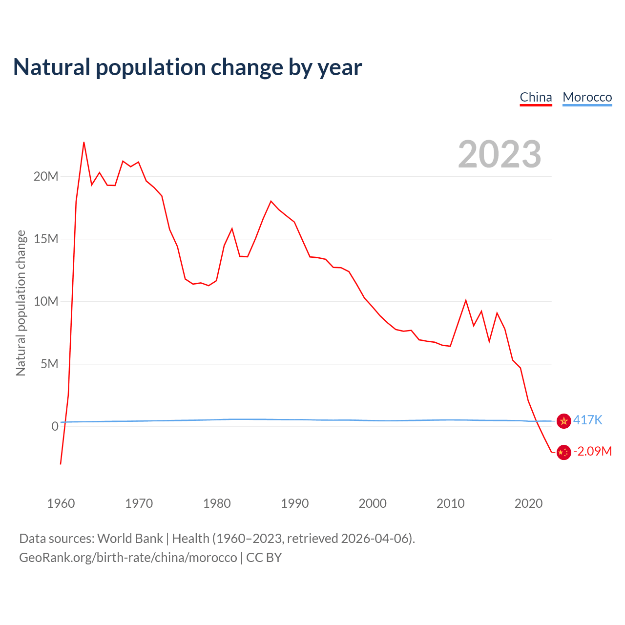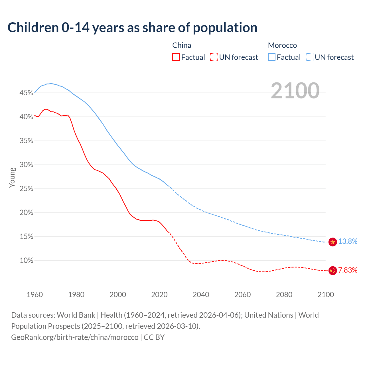 According to the latest available data on birth rates, the fertility rate in China was 1 children per woman in 2023, compared to 2.23 in Morocco in 2023. The replacement level is considered to be 2.1 children per woman.