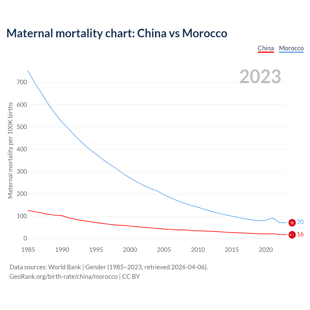 The maternal mortality rate, which is the probability of dying during childbirth or within 42 days of pregnancy termination, is 16 deaths per 100,000 live births in China, compared to 70 deaths in Morocco.