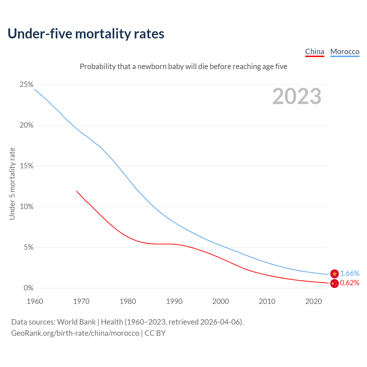 The chance that a newborn baby will die before reaching age five is 0.62% in China and 1.66% in Morocco. Above is a chart with historical data on under-five mortality rates.