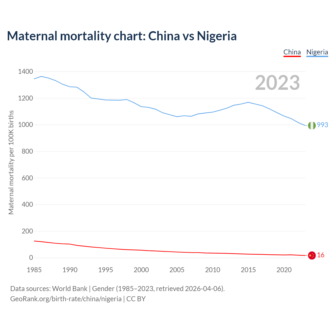 The maternal mortality rate, which is the probability of dying during childbirth or within 42 days of pregnancy termination, is 16 deaths per 100,000 live births in China, compared to 993 deaths in Nigeria.