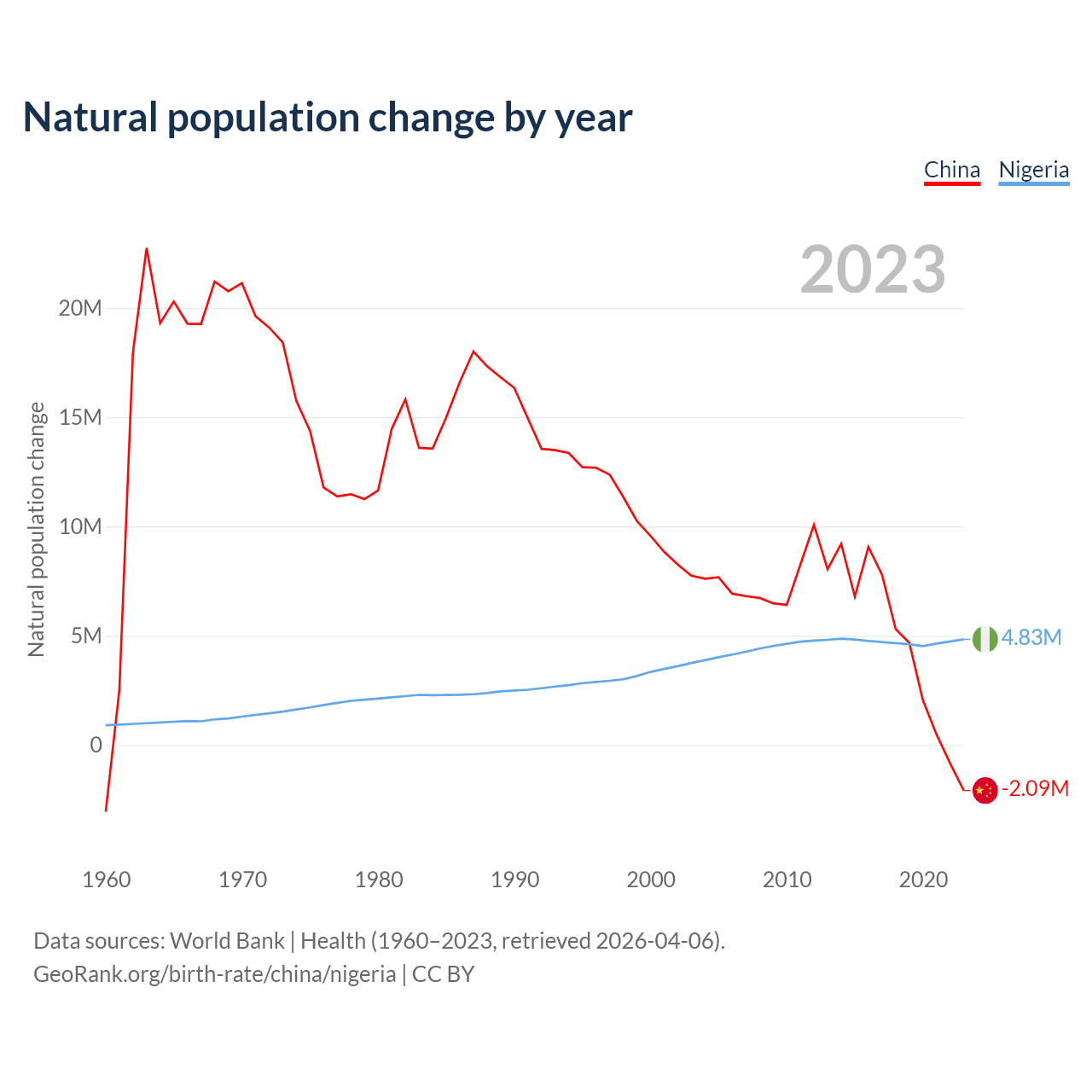 According to the latest available data on birth rates, the fertility rate in China was 1 children per woman in 2023, compared to 4.48 in Nigeria in 2023. The replacement level is considered to be 2.1 children per woman.