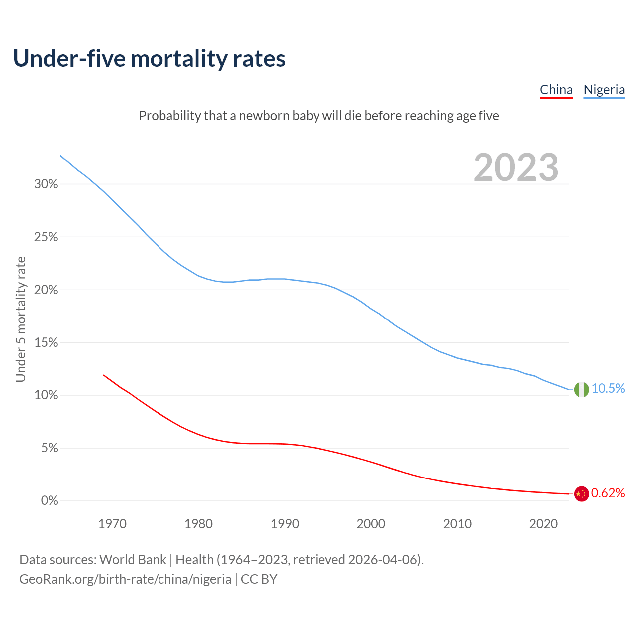 The chance that a newborn baby will die before reaching age five is 0.62% in China and 10.5% in Nigeria. Above is a chart with historical data on under-five mortality rates.