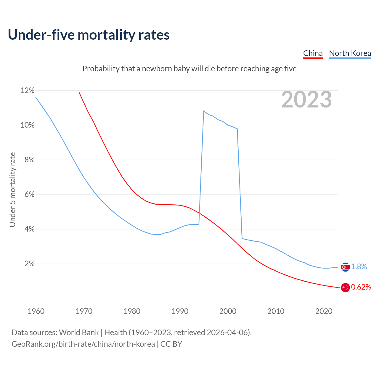 The chance that a newborn baby will die before reaching age five is 0.62% in China and 1.8% in North Korea. Above is a chart with historical data on under-five mortality rates.