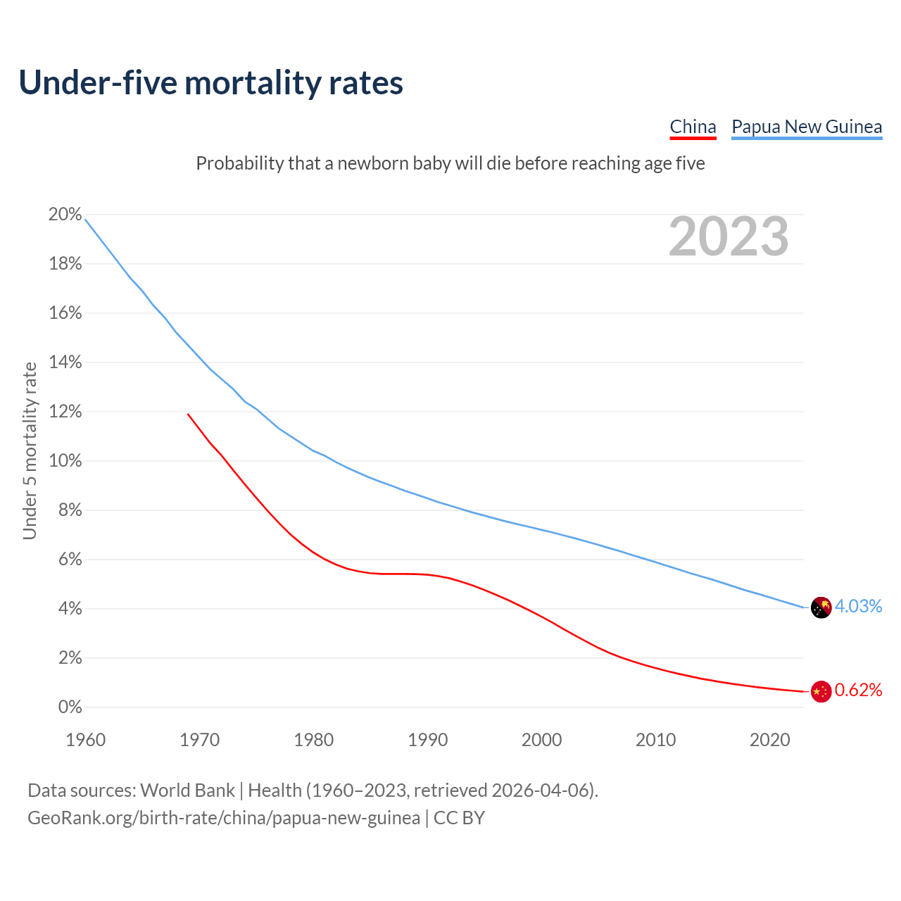 The chance that a newborn baby will die before reaching age five is 0.62% in China and 4.03% in Papua New Guinea. Above is a chart with historical data on under-five mortality rates.