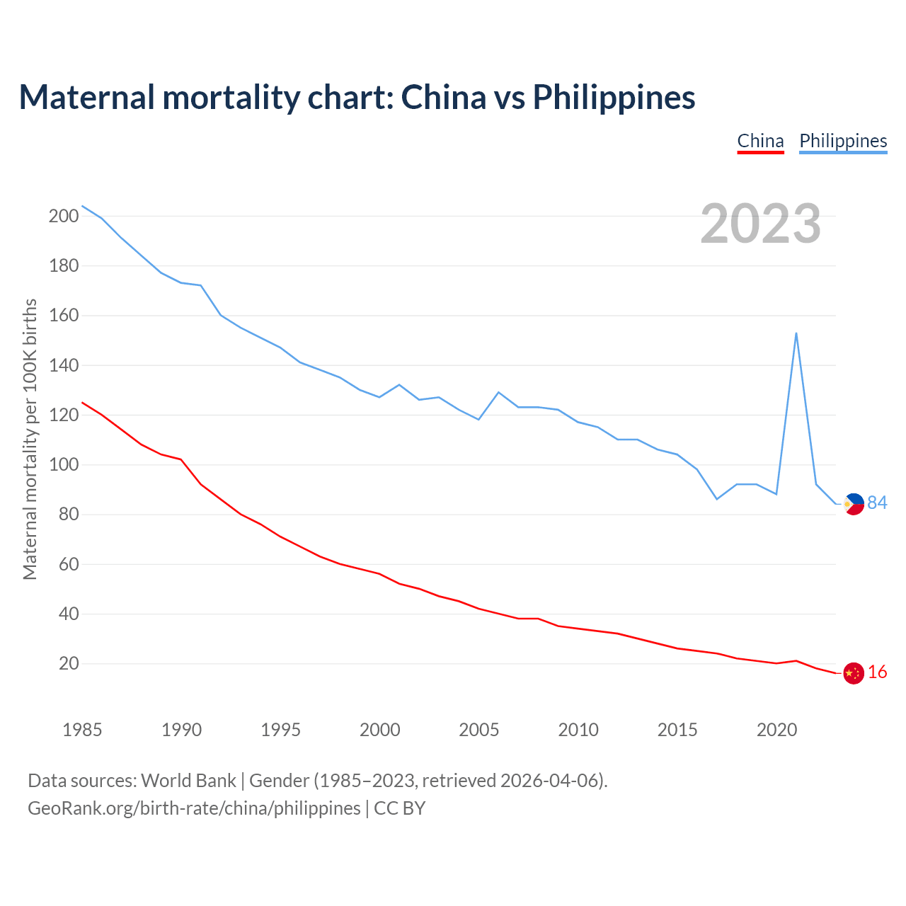 The maternal mortality rate, which is the probability of dying during childbirth or within 42 days of pregnancy termination, is 16 deaths per 100,000 live births in China, compared to 84 deaths in the Philippines.